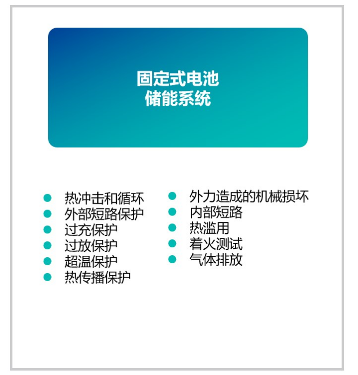 2024年8月起,电池法要求固定式电池储能系统需提供安全技术文件,其中包括进行以下必要的安全测试。