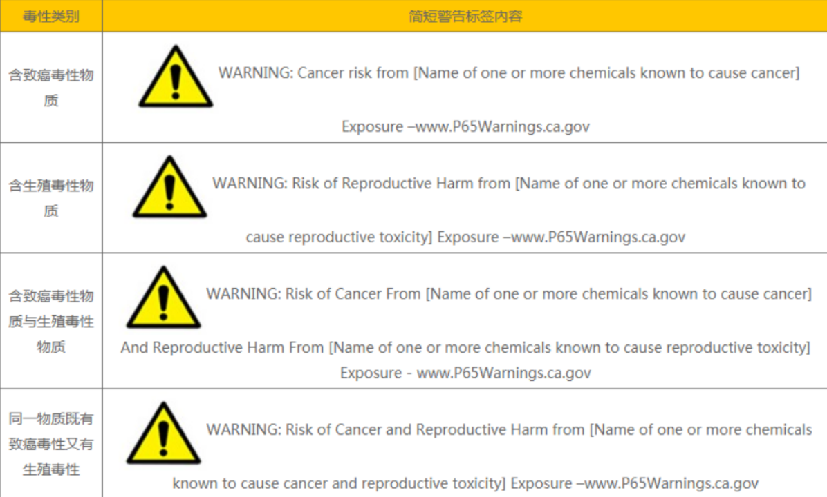 物质暴露大于管控水平时,企业应提供加州65警示。某一种化学物质被列入清单后,制造商和经销商须在一年内完成警告的执行,在20个月内终止化学物质排放至饮用水源头。